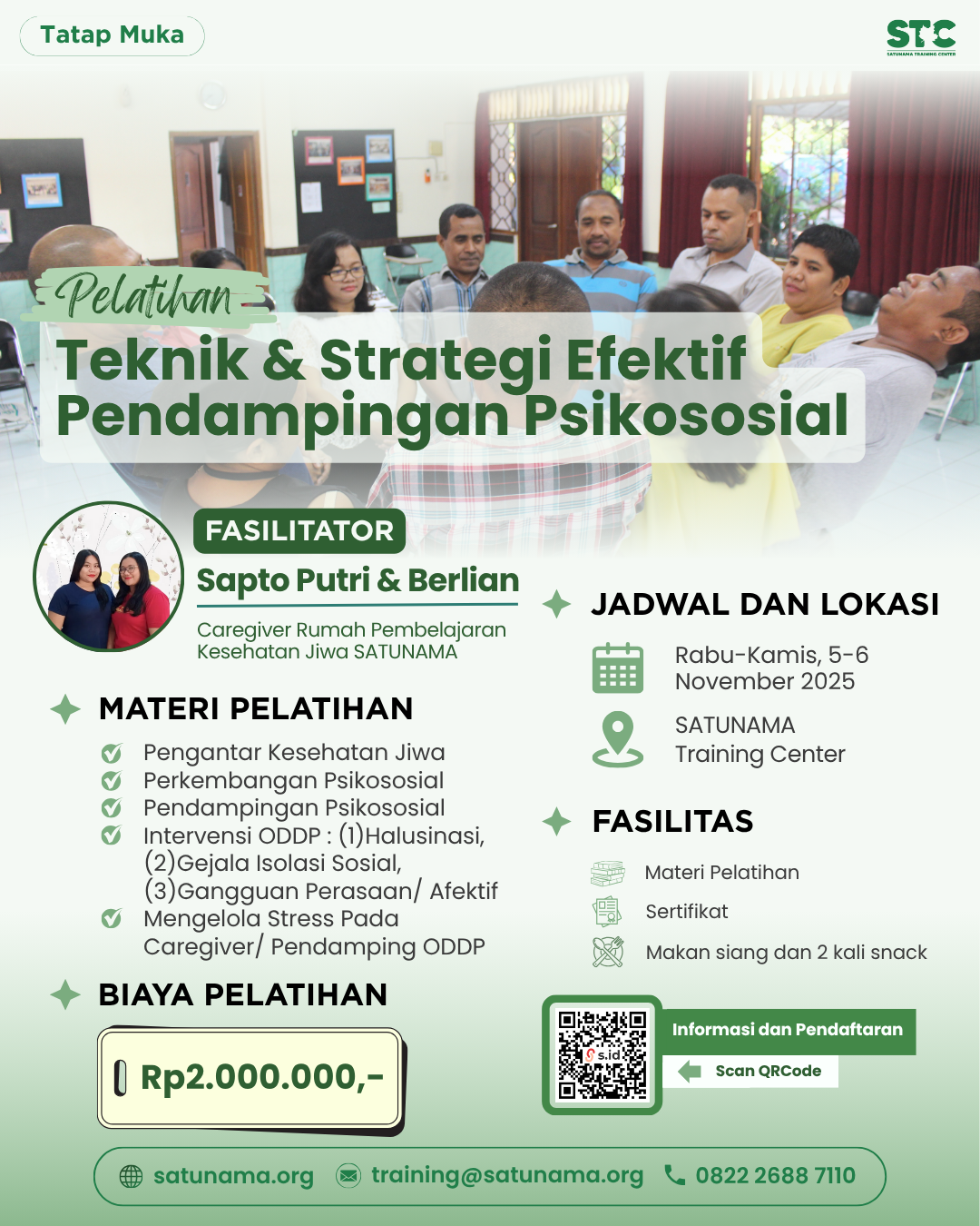 Fasilitator : Berlian , Sapto Putri Kuota Peserta : 10 Orang Metode Pelatihan : Offline Lokasi Pelatihan : SATUNAMA Training Center Fee Pelatihan : Rp 2.000.000Teknik dan Strategi Efektif Pendampingan Psikososial